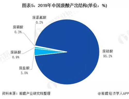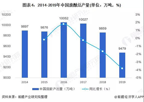 2019年,中國(guó)廢酸總產(chǎn)量為9479萬(wàn)噸,同比下降3.9%。廢硫酸為主要主要廢酸產(chǎn)出種類,2019年,廢硫酸產(chǎn)出量為9020萬(wàn)噸左右,占廢酸產(chǎn)出量的95.2%。
