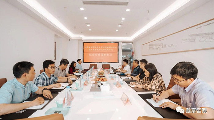 江蘇建院劉盛賢書記充分肯定了鑫泰公司在鍍鋅領域信息化、自動化、人工智能等方面所取得的成就,表達了對熱鍍鋅行業人才戰略校企合作的意愿;詳細介紹了江蘇建院雄厚的師資力量、先進的實訓設備以及豐碩的獲獎成果,表示建院非常愿意與鑫泰公司通力合作,尤其是建院智能制造學院的專業與鑫泰公司主營業務高度匹配。介紹了以往合作典范和所取得的成績,如與徐工集團、徐鍛集團、華東機械等國內知名企業建立了50多個實訓基地,與江蘇中煙公司徐州卷煙廠、徐工集團、上海振華、徐州地鐵等企業組建了“徐工班”、“地鐵班”、“振華班”。劉盛賢書記表示即將與鑫泰公司一道組建“熱鍍鋅專業班”,在教學課程安排上與企業實際需求接軌,人才培養機制采用“訂單”模式。將鍍鋅行業實際需求的機電、工程、表面處理等技術與原有的機電專業基礎課程進行有機組合,進行獨具特色的理論教學;實習期間將學生送至鑫泰公司表面處理園區實習鍛煉,切實將理論知識和實際應用相結合,使學生真正具備“畢業即就業”的能力,實現“產學研訓創”一體化實踐教學,學生畢業直接進入鍍鋅企業就業。